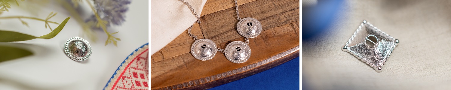 Kaunis hõbedast sõlg. Sõled annavad rahvariietele viimase lihvi. Ehe on disainitud ja toodetud Eestis.